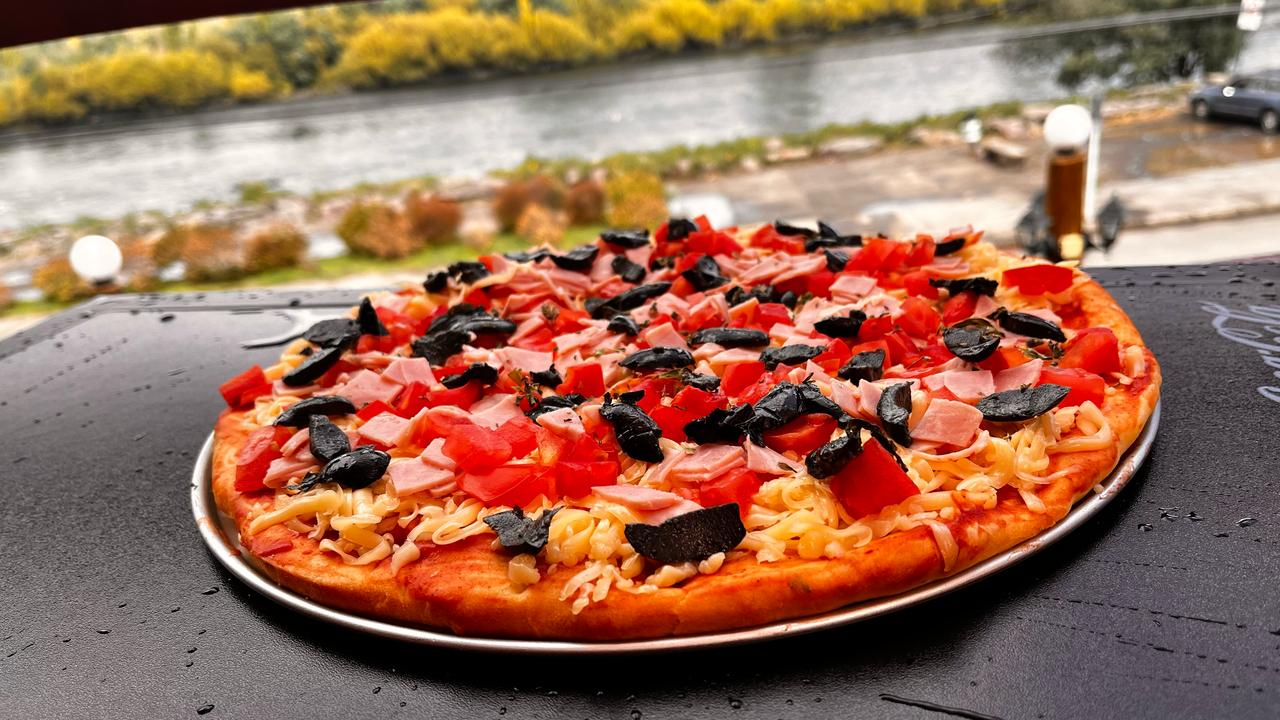 Carne de cerdo, carne de vacuno, carne de pollo, queso fundido, tomate, poroto verde, champiñón, aceituna y maíz
